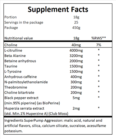 As a dietary supplement, take 1 scoop with 6-8 oz. of cold water 20-30 minutes prior to training. SuperPump Aggression should be used on training days only.