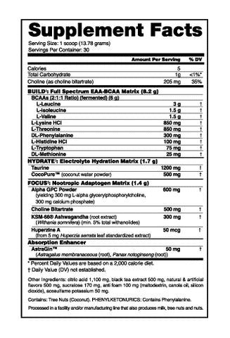 Alpha EAA is an efficaciously dosed essential amino acid formula that is unlike any other amino acid product out on the market today. Not only does Alpha EAA include a full-spectrum EAA matrix featuring 8.2 g of EAA’s and 6 g of fermented BCAA’s but we added a focus and hydration complex as well. It’s this focus matrix that really puts this product over the top and differentiates it from any amino based supplement available. Our focus matrix is comprised of a combination of the world’s most popular adaptogen, Ashwagandha KSM-66 and three of the most effective nootropics around, Alpha-GPC, VitaCholine and Huperzine A. To round out this novel formula and enhance it even more, we included taurine and CocoPure to support hydration and AstraGin to increase amino uptake and absorption.