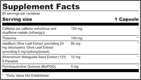 The legendary Alphamine, now in a capsule format. Each capsule delivers a burst of thermogenic energy from two forms of caffeine, aframomum melegueta (6-paradol), theanine, and our unique blend of olive leaf extracts providing both hydroxytyrosol and oleuropein. This carefully formulated fat burner delivers every time.